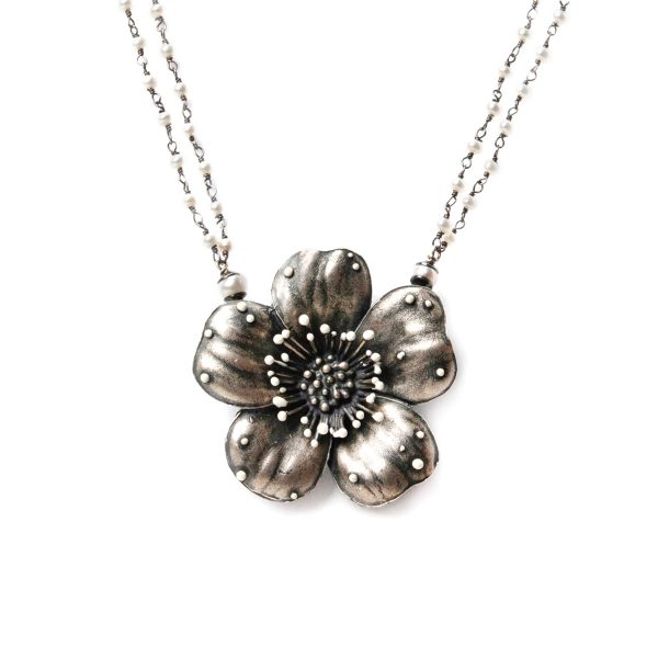 Collana realizzata a mano con la tecnica della fusione a cera persa, in argento 925 naturale ossidato e dipinta a smalto. Pezzo unico.